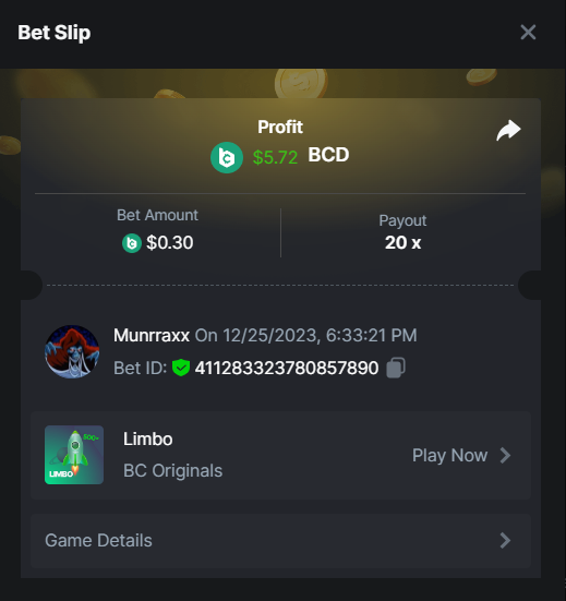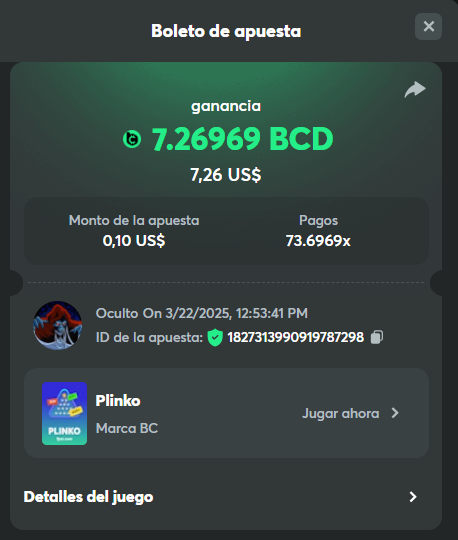1. HARD 6. Limbo game is your target to win 200x or higher. https://bc.game/game-detail/1827307434501201443 1. Win on Wheel 48x or higher - Row 50, Segment High. https://bc.game/game-detail/1827312844856712226 Medium 1. Deposit At least $100 USD ID order: A-1827314325195331211 Txid: e697040c85293ef8ca2a8c32649fb68f7656cdb9244fd779d4c1b0616811a910 3. Get a payout of 73.6x on the original Plinko game Risk-High, Row-10. https://bc.game/game-detail/1827313990919787298 10. Buy at least 30 BC Lottery tickets using $BC Token. -or- Buy at least 2 BC Porsche lottery tickets using $BC Token send screenshot in forum post. 11. Win a sports parlay/combo bet with at least 3 matches and a 2.5x minimum payout to qualify. Ticket ID: 2515967632226787902 Easy 1. Deposit At least $50 USD ID order: A-1827314325195331211 Txid: e697040c85293ef8ca2a8c32649fb68f7656cdb9244fd779d4c1b0616811a910 2. Follow BC.GAME on Instagram, take a screenshot, and share it with your IG username in the forum! @yofreclavijo 4. Follow BC.GAME Twitter Take a screenshot of the following and include your Twitter username in the forum. @Mun11643102 5. Like and Retweet BC.GAME's latest post and tag at least 3 of your friends. Take a screenshot and include your Twitter username in the forum. @Mun11643102 6. Follow BC.GAME Facebook. Take a screenshot of the following and include your FB username in the forum. https://www.facebook.com/yofreclavijo/ 7. Win a payout of 20x on the original Limbo game. https://bc.game/game-detail/1827344509511945506 8. Win a Sports bet with a minimum payout of 1.5x odds (Only for single bets). Ticket ID: 2515280450730209380 9. Get a 20x multi in the Arabian Secret slot game. https://bc.game/game-detail/1827346561720961313 11. Activate 2FA security on your BC.Game account. Take a screenshot of 2FA and keep it active till the result is announced.